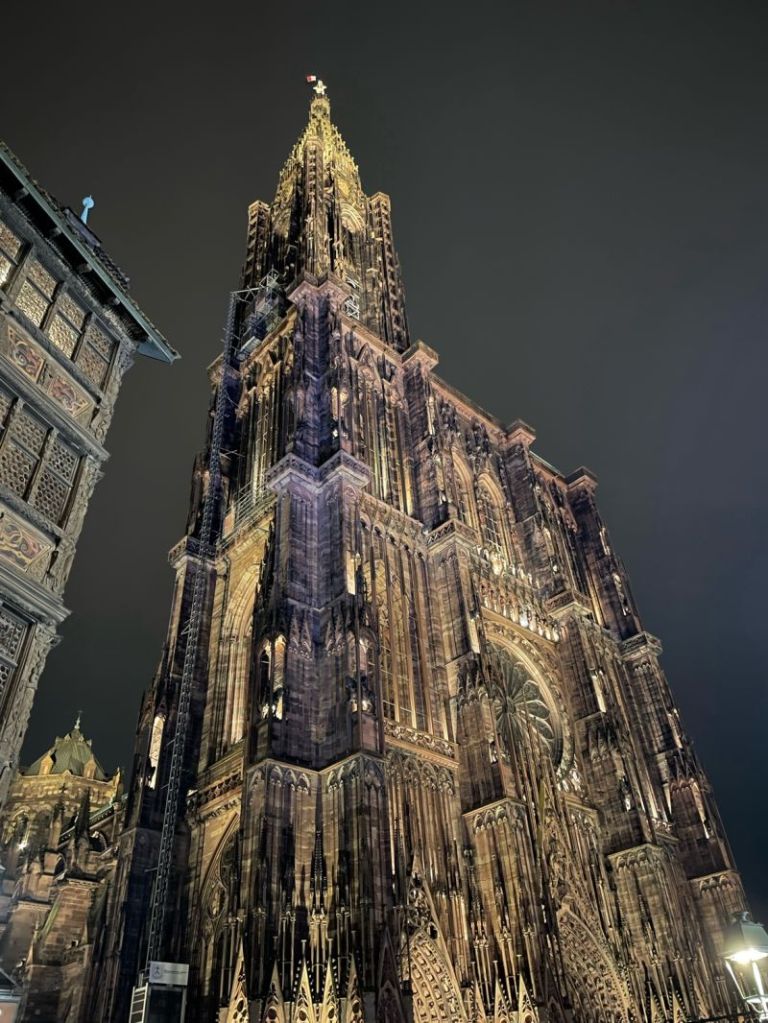 Voici pour encore quelques jours de marché de Noël le monument le plus photographié de France en ce moment : la cathédrale Notre Dame de Strasbourg et sa somptueuse flèche unique gothique, et sa légende d’un lac souterrain.